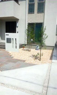 今後雑草の心配はないです。アクセントに植木を4本植えさせていただきました。エゴノキ、カツラ、シマトネリコ、オリーブです。