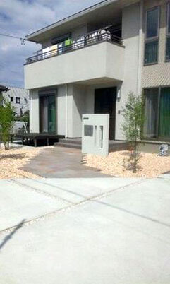シンプルなお庭になっております。すっきりとしたコンクリートと、黄色系の砂利を使い、明るくなっています。