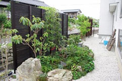 お客様のイメージが、和みの空間・創造の空間・人や愛犬が和めるお庭がテーマで、道行く人が楽しんでもらえるようなお庭をとの事でしたので、こちらも勉強させてもらいながら、提案させていただきました。
