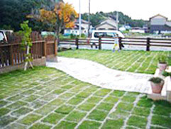 門柱とアプローチは、イギリスのコッツストーンを使用しました。 芝生を張り、ガーデンテラスは、石張りに仕上げさせていただきました。