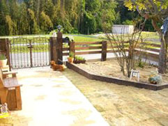 テーマはカントリーガーデンです。枕木を使ったウッドフェンスは全て当社の手造りです。