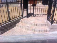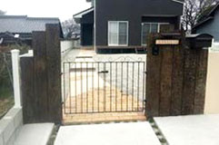 アンティーク風がご希望でしたので、枕木、レンガ、アイアン門柱を 使用し、施工させていただいています。