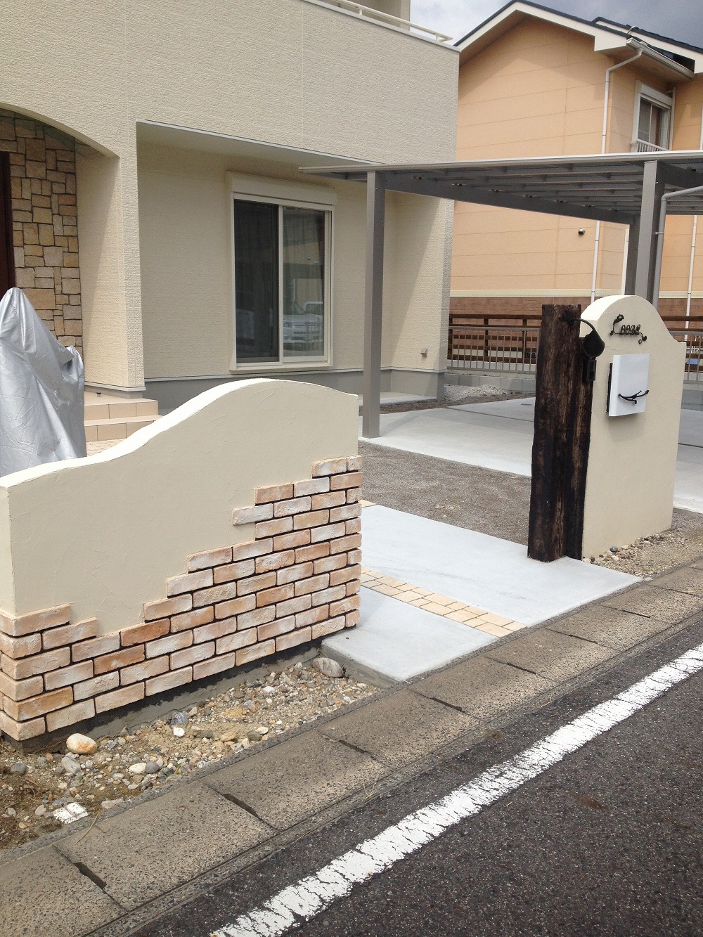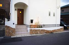 ご縁があって施工させていただきました。玄関の石張りがとても素敵で、それに合う古代ローマのカッシア街道の様なあたたかみのあるアプローチにさせていただきました。 門構も同じ基調でシンプルに、アイアンの表札と門燈がアクセントになっています。緑を植えたら完成です。
