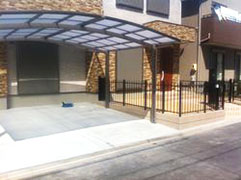 駐車場、セッパンガレージ、フェンスを施工しました。 ガレージの屋根はクリアを取り入れ、明るい仕上がりになっています。