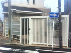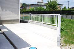 こちらのお宅は道路に面しているので、少しボリュームのある門と目隠しフェンスを使用させていただきました。 目隠しもクリアな感じを使用してますので明るい外構になっています。
