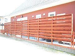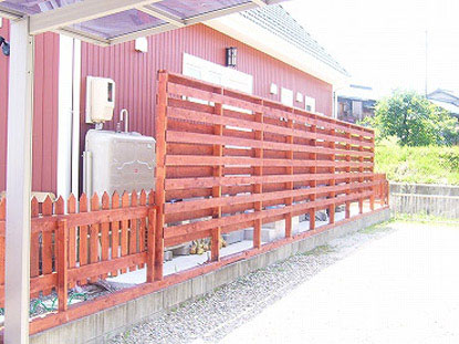 「手作り感のある暖かいイメージの木製フェンス」がご要望でした。 窓・ドアがある所では遮光・プライバシー保護を兼ねた高さのあるフェンスを設置し、その他の家屋外周は開放感のある低めのフェンスを設置しました。